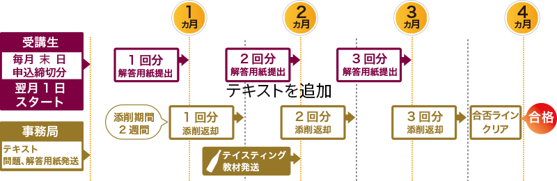 | 受講スタート時期 | お申込いただきました翌月1日からのスタートとなり、初回時に教材の発送をいたします。